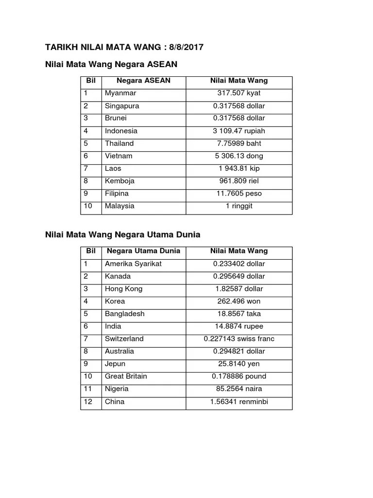 Mata uang suatu negara berfungsi sebagai alat transaksi sah yang digunakan oleh penduduk negaranya. Pahami beda nama mata uang vietnam, nama mata uang filipina, dan mata uang negara singapura. 5688 keputusan untuk 'mata wang negara asean'. Focus your studying with a path .
